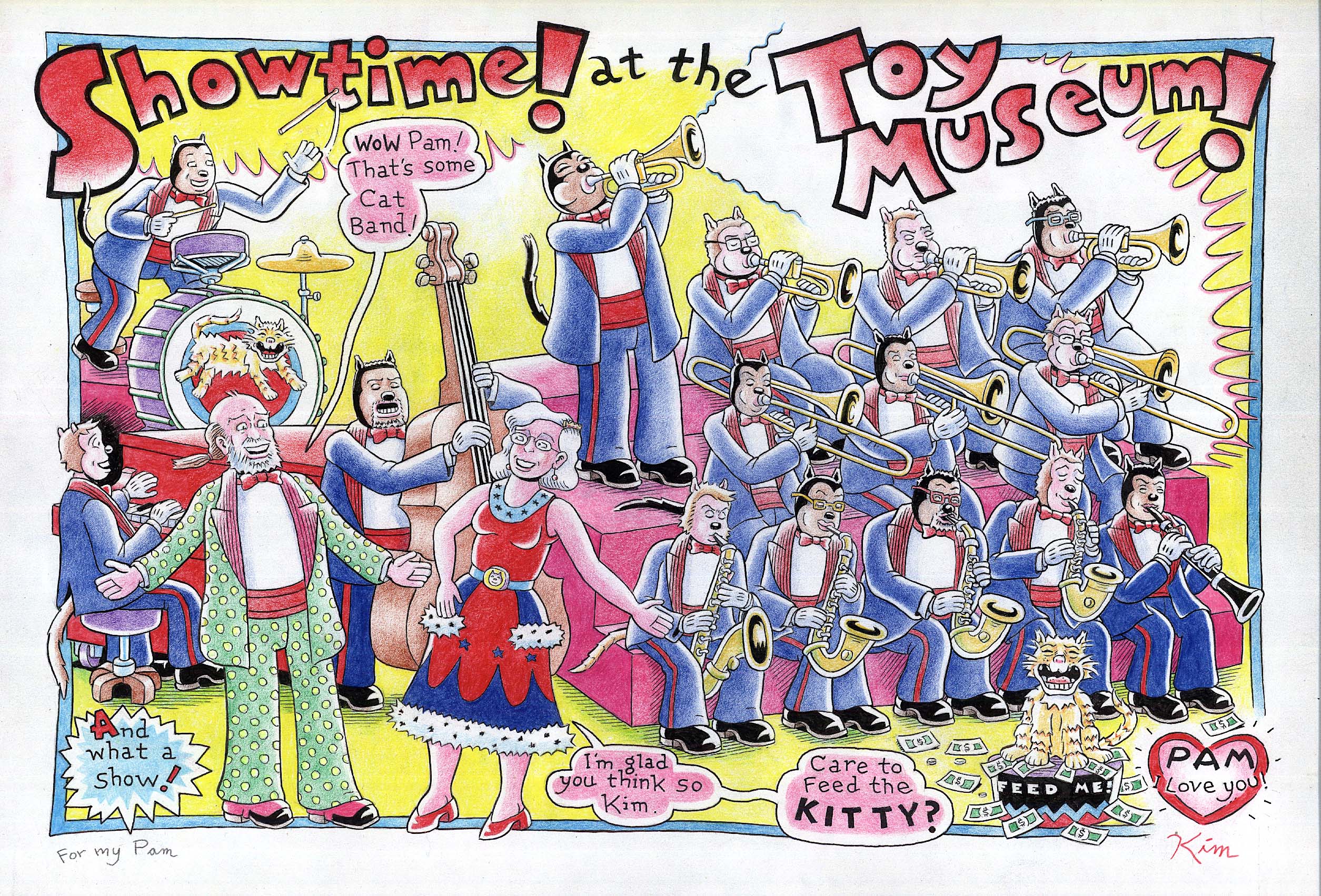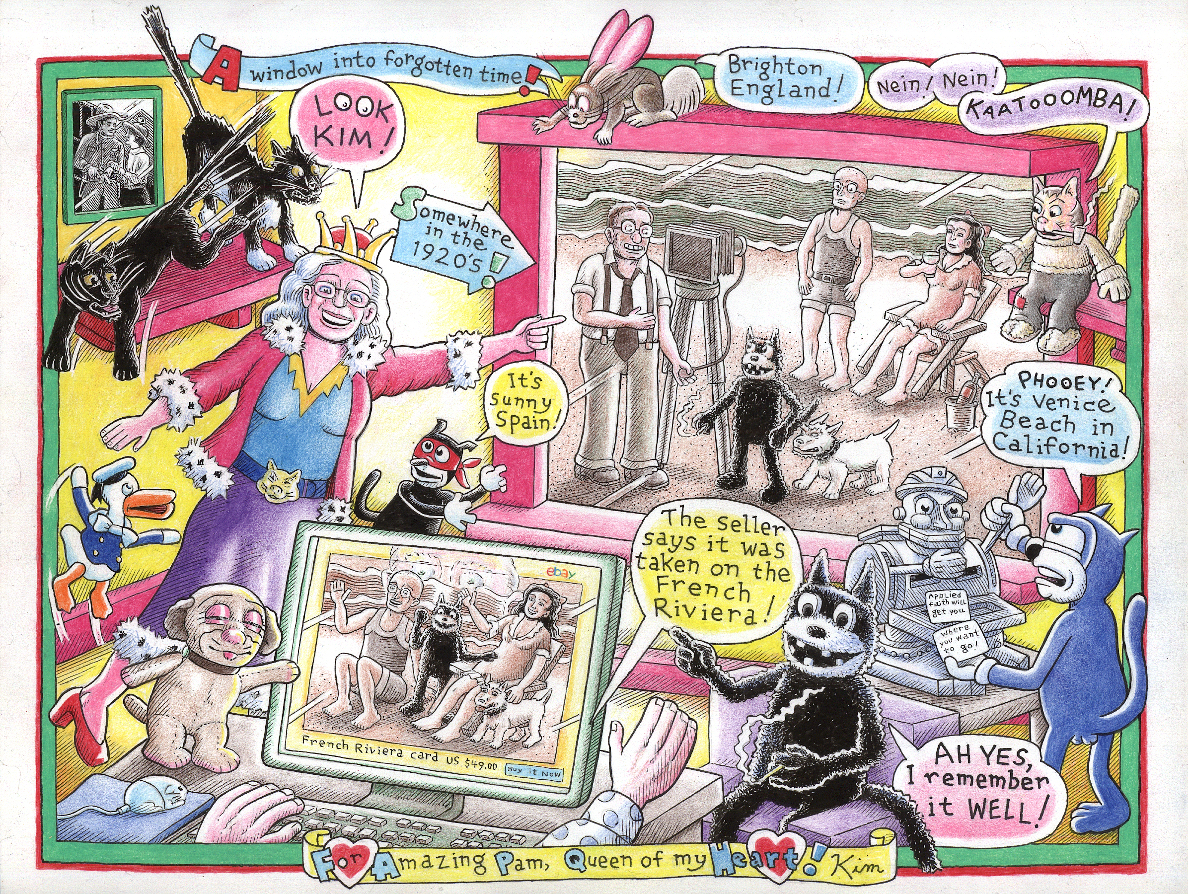 As someone whose birthday falls right before Valentine’s Day (it was this past Wednesday and more about a very extraordinary birthday gift in another post), back in our first or second year together I asked Kim for a drawing for my very own. The earlier efforts were a bit more simple, but the project grew like topsy in subsequent years and now it is an elaborate full-on several week drawing extravaganza, and each year really does seem to top the year before. As the ultimate Kim Deitch fan (yes, it is me!) there really couldn’t be anything more exciting or a greater honor. A handful made their way to an exhibit in France years ago and it is my greatest pleasure to be depicted so lovingly in these – always surrounded by my passions of cats and vintage toys!