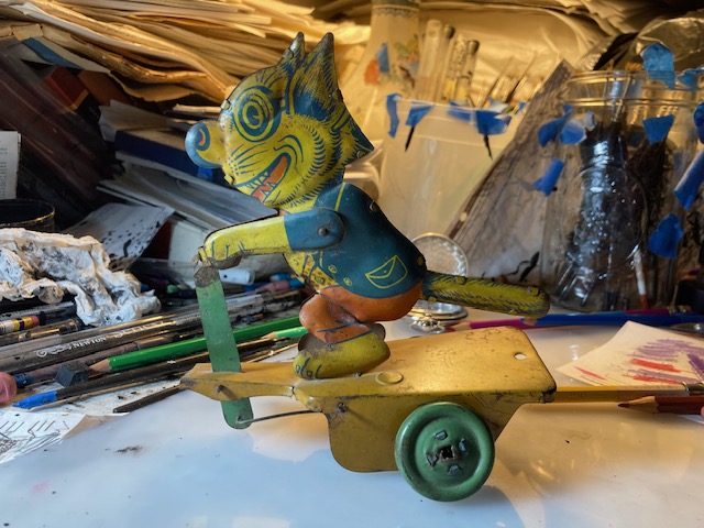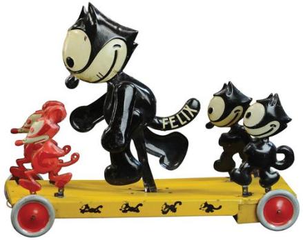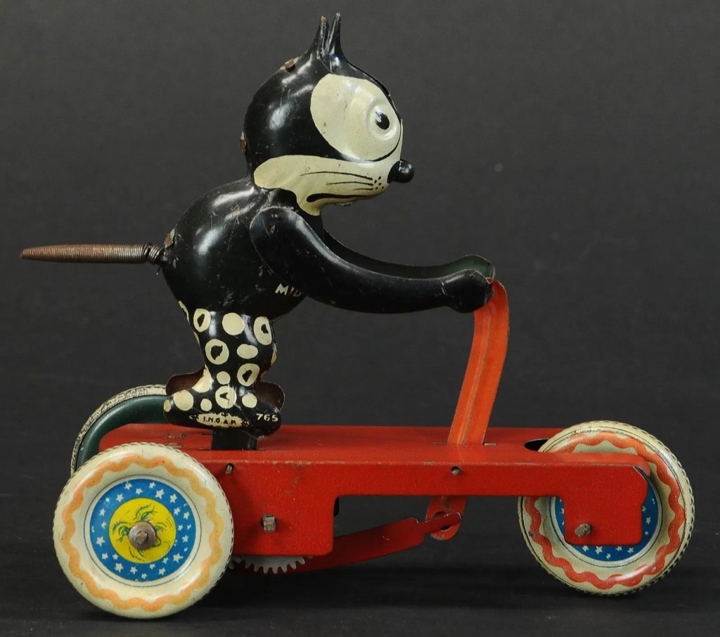 This fake Felix was made by Chien toys. The Chien toy empire was founded by Julius Chien in New York in 1903. He got his start making the Cracker Jack toys and found his way into inexpensive tin toys, mechanical and often character toys. The business peaked in the 1930’s and ’40s and in later decades (sadly) broke off into housewares. He probably also had the license on the actual Felix so I wonder how this impressive Not-Felix came to be and why. There market was flooded with them as shown in part below.