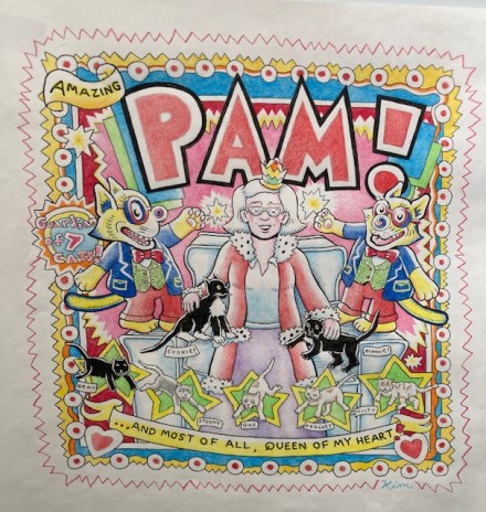 This drawing is largely just wild color and fun design that draws you in – like it can hardly contain itself! It is Kim at his best in that way I think and I am so pleased to have been the inspiration for it.