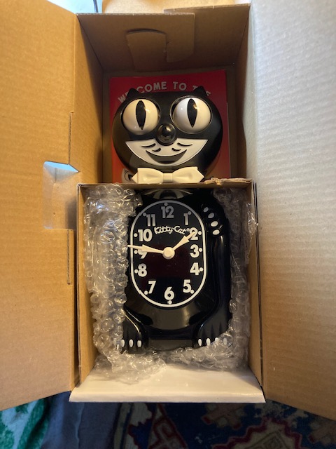 I find them very cheerful and the new design has the advantage of functioning while sitting on a shelf without the tail, if you are so inclined. (In my experience the tail is the weak part of the operation, and I believe in the older design the clock didn’t work without it swinging.) I always had it on a wall in the kitchen and I may return to that location – I like a clock in the kitchen although now there’s the microwave. Anyway, I purchased the classic black option – as interesting as the other colors were. My former brother in-law was scared of Felix clocks in the way some people are afraid of clowns. I never understood it but was concerned back in the day when I thought he might come to the apartment.