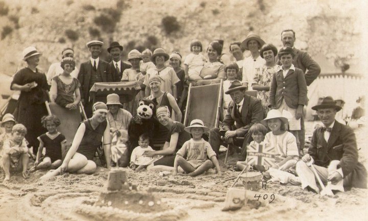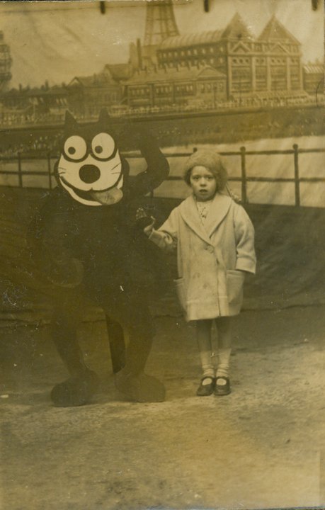Pam photo postcard blog post. So today I start at square one for me and a pleasant August beach-y theme to suit our vacation mode; folks posing with Felix. The first one I ever saw was in a wonderful book on the history of Felix that Kim gave me when we first got together. There is this single amazing image from a museum in Australia, I think (Australia, New Zealand and the UK is where they all seem to originate from – which begs the question – why the heck weren’t they being made here? Coney Island? I’ve never seen one taken in the US – anyone?) and man, if you had told me in those pre-eBay days that I would own 40 or so of these I would have figured I had died and gone to heaven! To even see one in person seemed unlikely – I didn’t even know that they were running around in the world, although I should have suspected. As you can see from the one in the bottom, this also embraces the too cheap to purchase a real stuffed Felix photo – these are fun too. People also liked to pose with their own Felix – the same as they liked to pose with their own cats.