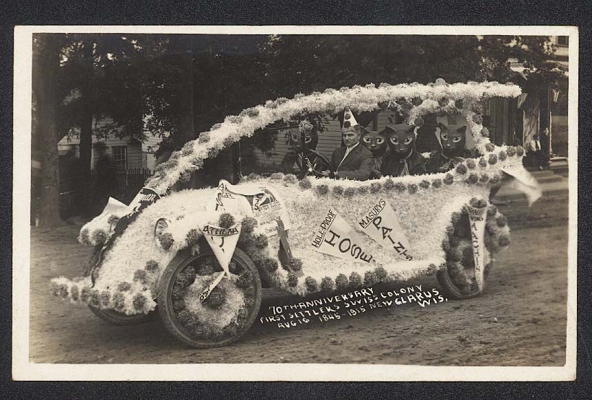 Pam’s Pictorama Photo Post: While clearly not Felix these cats are pretty spectacular in their own right – not to mention the little Shriner-esque fellow driving. This float was honoring the 70th Anniversary, Swiss Settlers Swiss Colony, August 16, 1885-1915, New Glarus, Wis. (I have taken the liberty of checking up on New Glarus and, sure enough, it is still known as America’s Little Switerzland today.) The stand-out supporters of this float appear to have been Hole-Proof Hosiery and Masurys Paints. Sadly the other banners do not appear to be legible, even when I blow this up. The support of these fine businesses now lost to the sands of time.