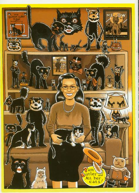 (A bad photo with Kim’s arm mysteriously holding him aloft. Photo quality here all over the place and I am sorry for that – as many of you already know, we live in a cramped studio apartment and sometimes it is hard to find a place to photograph the larger toys.) I knew he was an early toy and I really liked the look of him. I bid and determined to win him, but I was waiting until closer to the end to bid on him. So certain was I about winning him, that Kim, hard at work on Alias the Cat at the time, included him in the portrait below, ultimately used as the back cover of the comic book and called the picture, Pam Butler and All Her Cats. (The original art for this, hand colored, resides in my office where I get to see it daily!) A bit unprecedented, including a toy that I didn’t yet own, but Kim worked from the listing photo and he looked good in it, see lower right corner.
