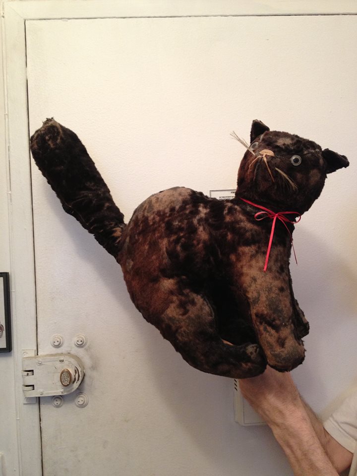 Then, mysteriously, the listing disappeared and I received a message from eBay that seemed to imply something not quite right with the seller and that the listing was eliminated. Arg! What could I do? Disappointed, I kept the scan in my file and moved on. About six months later – bam! It turned up again under a different seller name. It has certain fade marks on it and although it was a different photo I was sure it was indeed the same, exact cat. Just prior to the Fourth of July weekend, I received an email. Would I be interested in buying the toy outright? The seller said that they had purchased it at a live auction recently to flip and needed the money – they were afraid that with the auction occurring over the holiday weekend it wouldn’t sell. When asked they claimed that they knew nothing of the prior listing on eBay. I took a chance, and here he is! An important part of the family.