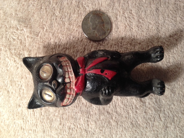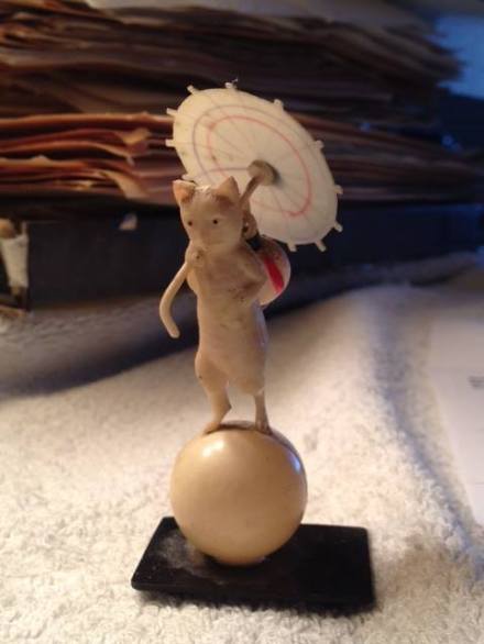 With the exception of the cat playing the fiddle below, a gift from Kim, these were all purchased on eBay for very little money and I deeply suspected I was the only one who appreciated what they were. The cat with the parasol is the most recent purchase, last February I believe. I think it is very beautiful – almost as if it was made of ivory rather than plastic. The Felix next to him is missing his tail and the strings holding him together are looking for an excuse to break. He came with that small indentation in his chest. However, I have quite simply never, ever seen one like him. The smiling kitty that rounds out the group is clearly a kissing cousin to the one with the fiddle. These are both Japanese toys – there are other cats in the band along with the fiddle player but I have never been able to lay claim to another. The fiddle player was closer to black when I first got him and has faded to this red color over time.