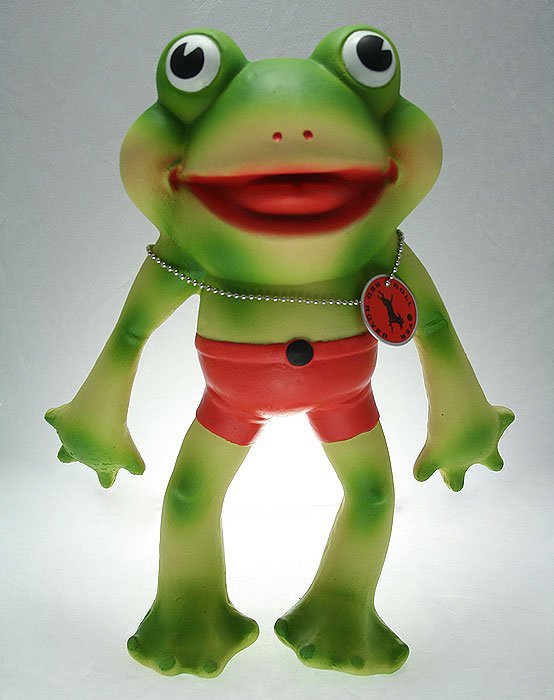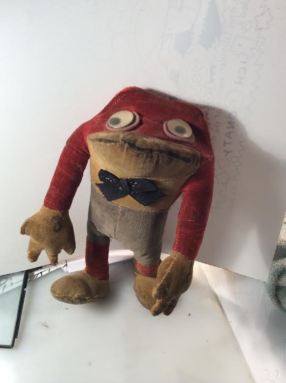 Pam’s Pictorama Toy Post: The Frogs have it! Let me start with this – I don’t collect frogs. (Not that there’s anything wrong with collecting frogs.) However, as a toy collector these three have found their way into our home. Starting with Flip who I purchased on eBay. He is made by Dean’s Rag Company and I consider him an undervalued toy. Mine isn’t in pristine condition (he’s an old, old frog after all) but I bought him, unchallenged, for very little. No one needed Flip that day, but me I guess. I am a fan of the Flip the Frog cartoons, although it wasn’t until well into adulthood that I caught up with them. (Kim introduced me to them. He saw them on tv as a child – says it was big news in their house when they went on tv. I’ve already discussed how impoverished my childhood was compared to his.) I can’t resist including a specimen cartoon – I don’t remember seeing this one before. Flip really is one strange looking frog – even when he isn’t playing a dentist.