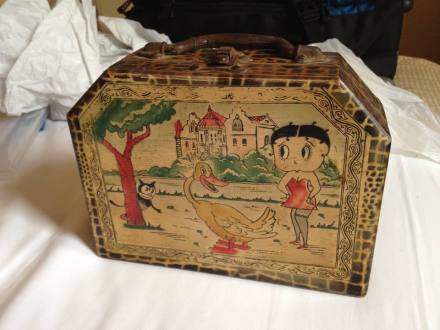 Pam’s Pictoram Toy (?) Post: Don’t know why, but this item has been on my mind lately so I thought I would write about it. Those of you who followed my purchases in the flea markets of Paris a couple of years ago (heaven!) might remember this. Never saw anything like it when I bought it, nor have I seen anything that was a kissing cousin to it since. It is a lightweight wood and decorated on all other sides with the sort of alligator print you see on the edges. Too flimsy for a lunch box – a purse perhaps? I guess the French really are different from us, yes? I mean, to think they live in a country where women once walked down the street carrying accessories such as this. Really a very civilized place.