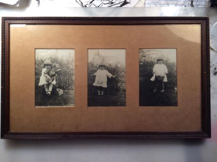 Pam’s Pictorama Photo Post: Another fine example of an item where Kim and I disagree! He’s never been fond of this triptych of toy photos, but I have always liked it since buying it many years ago on eBay. In recent years I have allowed it to be replaced on the wall by some images that we are more mutually fond of, but I stubbornly continue to champion it. My guess is that the small cat toy – barely visible here and in the lower right corner, is how it came to my attention. It really is all about this enormous, lovely teddy bear however. What a lucky little girl!