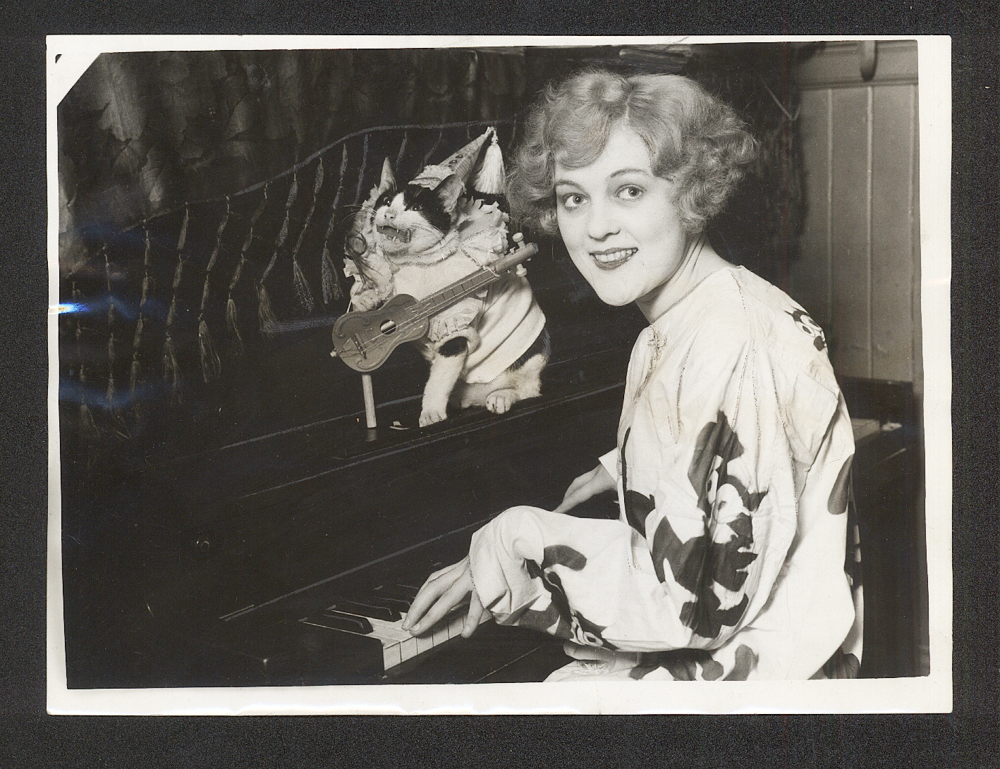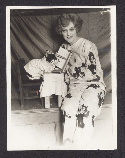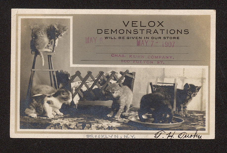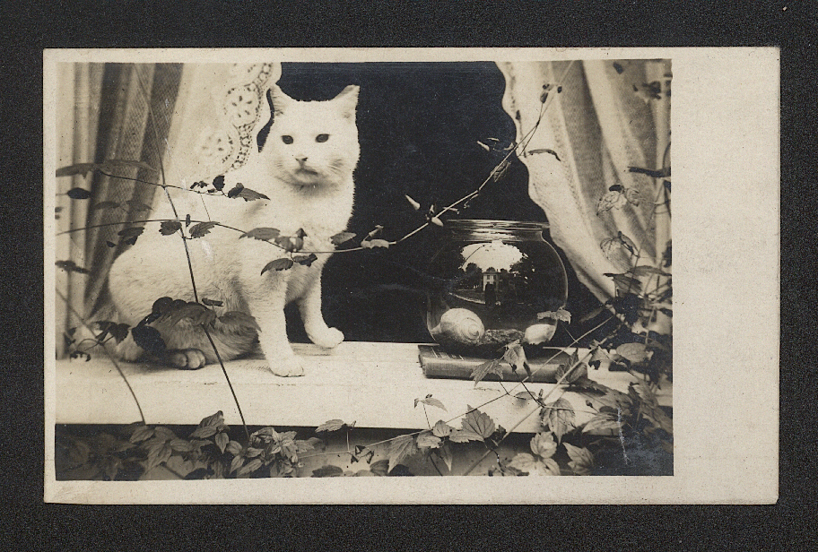 Pam’s Pictorama Photo Post: I guess it wouldn’t surprise anyone to find out that I have a soft spot for photos of men and cats. There’s something about these big tough guys scooping up their cat when their photo is going to be taken that I particularly love. (Previous examples in this category would be my posts Men in Hats with Cats and Tricks) In this one the great little tuxedo is looking up at the man adoringly. Nothing on the back of the card, a bit grimy. There’s a strange symmetry – two of the men wearing matching hats (a third hat is strangely hung high on the fence, does it belong to the man on the end?) and the men on each side with his arms across his chest in an identical pose. Love me, love my cat!