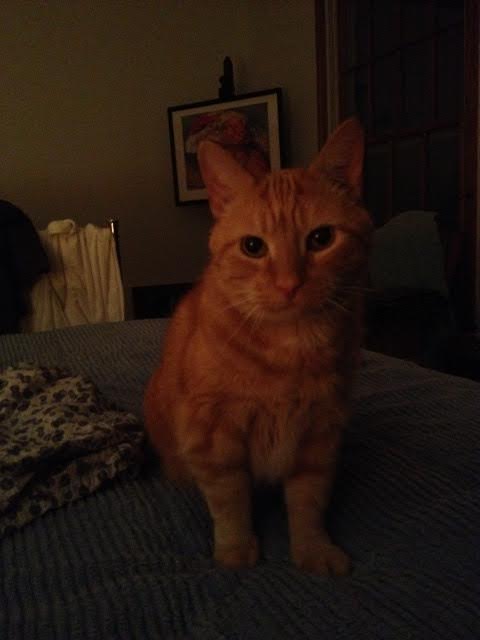 However, after retirement my father has, in many ways, gradually become the center of the Butler cat universe in NJ. Sitting on his lap is a prize spot and several denizens expect brushing and other attentions. There is another great orange cat in residence presently, Red, who adopts me for the night when I visit, on leave from my father’s room, to spend the night on my bed. (Don’t the Japanese have inns where you can rent a cat with your room for the night? Or am I conflating something else with the tea houses where you can go and pet cats?) During numerous visits last year when my father spent some time in the hospital, my mother (Queen of the various animals, domestic and otherwise, of their house) and I tended to many of the various cat needs – a visiting cat outside who needed feeding twice a day, one example – but they missed my father’s presence very much. That was about the time Red first adopted me, I guess he needed me and he has not forgotten me since my father’s return. Below is a photo of him on my father’s lap, and another of him watching over me in bed in my childhood room in NJ. Good kitty!