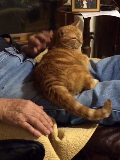 While I was growing up, my father seemed to only have a passing interest in the parade of cats that populated our world and I cannot recall a photo or image of him holding one of them. There was one or two he was perhaps a bit more partial too – our first cat Snoopy comes to mind. And there was tell of a cat he and my mother had before us kids were born, named Nudge, another orange striped fellow, who would hide and jump out and attack my father. (Never my mother – orange striped cats tend to be one person cats. Having said that, my father ultimately took up with my orange tabby, Pumpkin, after I left home and fed him smoked salmon from the table on a regular basis. Needless to say, they were tight.) My father neither objected to, nor paid a lot of attention to the cats of our lives. The German Shepard, Duchess, was his dog though and would wait by the front door for him to come home – even from long trips.