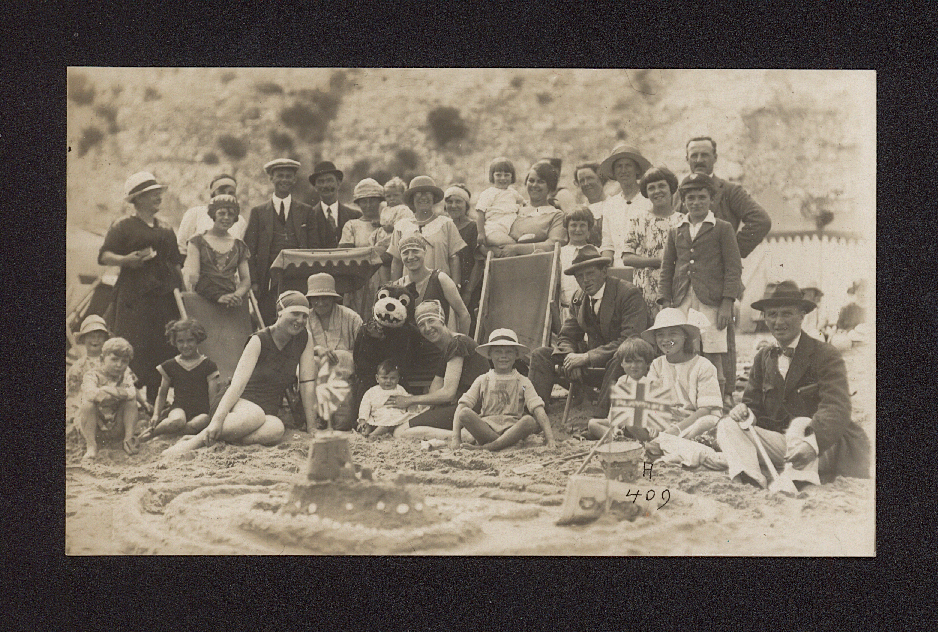 The family in the beach photo is more prosperous looking. It is a much larger gathering and everyone is beautifully turned out, despite being at the beach. They have made that lovely sandcastle and I like the way they have tucked Felix in as part of the family (he almost looks like he’s holding the baby!) so it takes a moment or two to even see him at first. There is nothing written on the back of the postcard, but clearly it was a treasured photo of a large family gathering. Who wouldn’t want to join that party? Frankly, I can’t say we ever had family gatherings in my New Jersey childhood that lived up to that. It does set the bar high however.
