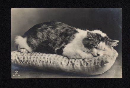 Pam’s Pictorama Photo Post: This fellow caught my attention recently. He looks so nicely settled into this pillow with that little tuft of hair sticking out at the back, over his hind leg. He’s giving us quite a look, under his slightly furrowed brow and almost closed eyes. The ability of cats to deeply enjoy (and employ!) sleep is one of their most well recognized traits. I don’t know about you, but when I am leaving for work on a cold and dreary day, the sight of my kitties settling in for a day-long snooze on the still warm blankets fills me with envy! While our bed is a cat free-for-all even that territory is generally carefully divided. Day-time sleeping allows for a different (more liberal) distribution than nighttime, which seems to break down to Blackie further up the bed, either between me and Kim or behind my knees. Cookie has a pillow at the foot of the bed (a relic from my foot surgery) that she generally claims at night. It is Blackie’s responsibility, evidently, to wake us in the morning. He never got the hang of the time change this year and persists in thinking that 4:30 AM is the right time for the first pass at us.