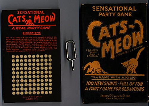 Pam’s Pictorama Toy Post: As we continue on with our Halloween theme, I present two splendid kitties from my collection. The first of these cats was among my very first purchases in the world of black cat toy collecting, and it is still among my very favorites. He, along with another excellent, much earlier cat (a future post) were scored in an antique store in Red Bank, New Jersey – near my ancestral home, while on a weekend junket to visit my parents. The second was purchased on eBay. That seller told me that it had been a prize his or her grandmother had won on a push pin board game in a store, and that it was from the 1930’s, which seems about right. This seemingly appropriate example of one of these prize boards is below, grabbed off of the internet.