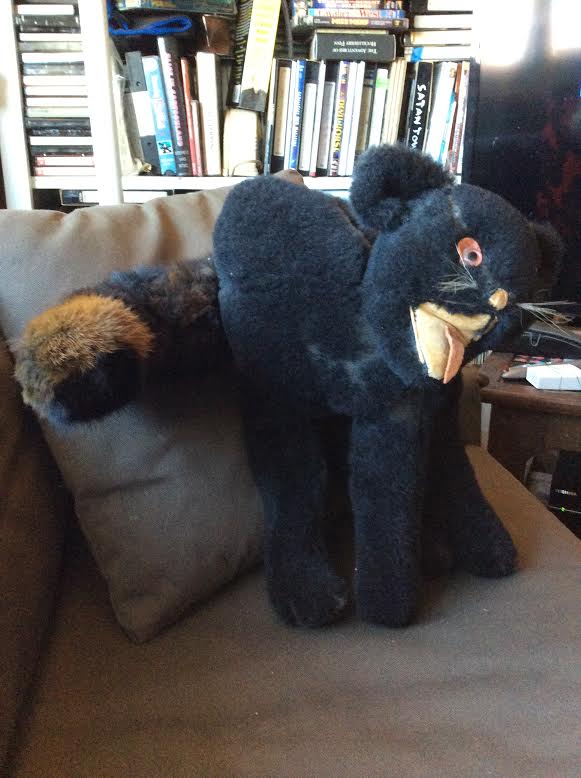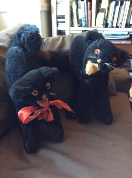 Both toys are in pretty superb condition – one maintains his bow – and sport magnificent fluffy tails, and virtually no bald spots on their plushy fur. The eBay one has a few condition issues – he does not really stand on his own any longer and his tail lists permanently to one side. Pretty good for a couple of elderly fellows though. They are the cheerful guardians of my cat shelf. I admit, I couldn’t pass one up and would contentedly buy additional ones if I found them. I mean, who wouldn’t?