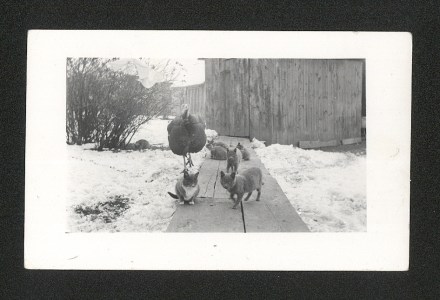 This card was never sent, but on the back, in pencil is written Lottie’s Tom & cats. Lottie’s gray cats have clearly multiplied and to my count there are seven in this photo. The one with the white bib looks somewhat philosophical, but the two gray ones coming at the camera – and Tom the turkey for that matter – have something more in mind. They are coming right at the camera. Take care, turkey eaters!