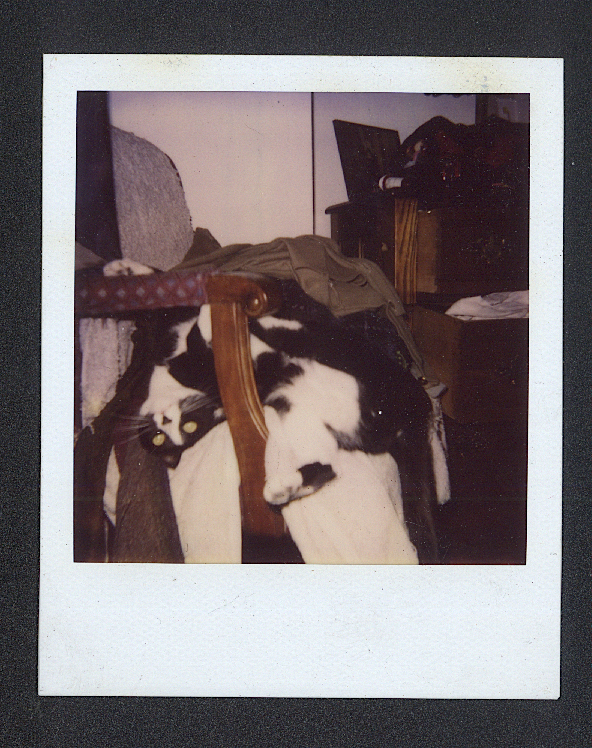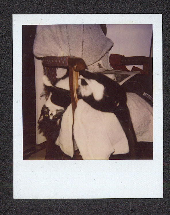 Meanwhile, although my cat Otto knew all about scratching posts and employed them, she had a fetish about Kim’s work chair. She is shown below, in a former apartment, in a series of polaroids Kim took over several days in April, 1995. Evidently she would take the chair on every day at the same time. Needless to say, she eventually denuded the entire chair. Kim continued to use it however, until the frame too fell apart one day, years later.