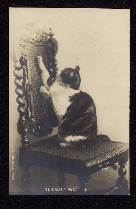 Like bunnies and beavers which have to nibble and gnaw in order to keep their teeth filed, I guess cats need to scratch to keep their claws sharp and from getting too long. Still, scratching is more than that to a cat – there is joy to scratching. Scratching is a way of marking your turf – it’s a statement. As shown here – it is both a cross cultural phenomenon, Mr. French cat, and one that goes back quite aways.