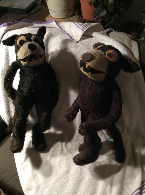 The existence of the toys came to me even later, but I fell hard for them. The promotional photo below was my introduction to them. Not surprisingly, the cat in the polka dot skirt was my first acquisition – The Countess. I bought her in a Hake’s auction (I believe Kim helped on that one – in fact I believe he’s had a hand in helping to purchase virtually all of these. He’s very nice about supporting my habit.) We really paid up. She is pretty pristine. The dog in the red pants (Don the Dog) came off of eBay and I got a pretty good deal. The very hurt one on the lower right (another version of The Countess?) Kim picked up during a visit to San Francisco a few years back. The slightly grimy one in the maroon corduroy, I frankly don’t remember acquiring, although I am thinking it must have also been on eBay – he seems to have been altered and I am not sure who he is – Raffles is my guess.