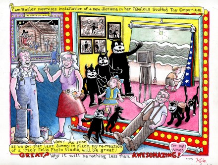 Kim has expanded our real estate holdings substantially, and in the Valentine I am in one of the many rooms in our building dedicated to dioramas scenes designed to feature my toy collection. (Oh joy! Oh bliss!) Here I am with a variety of life size Felix dolls, lined up for people to pose with – we all know it is one of my life’s ambitions to get my hands on one of those, let alone several as shown here. Cookie and Blackie are checking things out, and you can make out Waldo considering a room dedicated to his origin story as well.