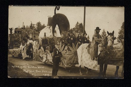 1909-In June, at high Noon, Rex Oregonus again coming up the majestic Willamette River from the greatest sea of them all, stepped ashore at the Stark Street wharf, masked and mantled in mystery, this time without a Queen. Great crowds of happy and enthusiastic people greeted his arrival. An epochal crowd, estimated by the press at 150,000, saw the stately floats glide by, among them the Queen of the Nile, the Palace of Perfume, King of the Artics, Fountain of Youth, Queen of the Flowers, and Father Time. The festival’s floats achieved national fame for beauty and cleverness of design. (See more at: The Royal Rosarians – The Early Years)