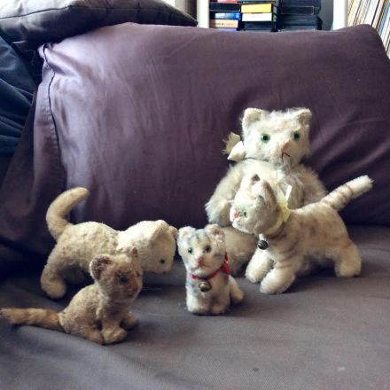 Pam’s Pictorama Toy Post: In the process of packing and unpacking toys recently, I realized that somehow along the line I had acquired a small coterie of white cats in contrast to my substantial (and well documented) collection of black cats. Three of these fellows are Steiff and two have no identification. The Steiff with the bell and red ribbon was purchased by Kim at a store in Cold Spring, New York, for me. The all white kitty on all fours, without stripes, came from a small shop in Dresden and I bought him while traveling there for the Met. (He kept me company on the remainder of the trip and made my ship’s cabin feel more like home.) I almost wrote that the others came off of eBay, but yet when I think about it I know they did not. The strange rule of Pam purchasing white cats seems to be that I do it in person and it is an impulse buy. Sadly I have no specific memory of the origin of the remaining cats. I do wish I could remember where I got the largest of them – he really is a splendid cat and I can see why I bought him.