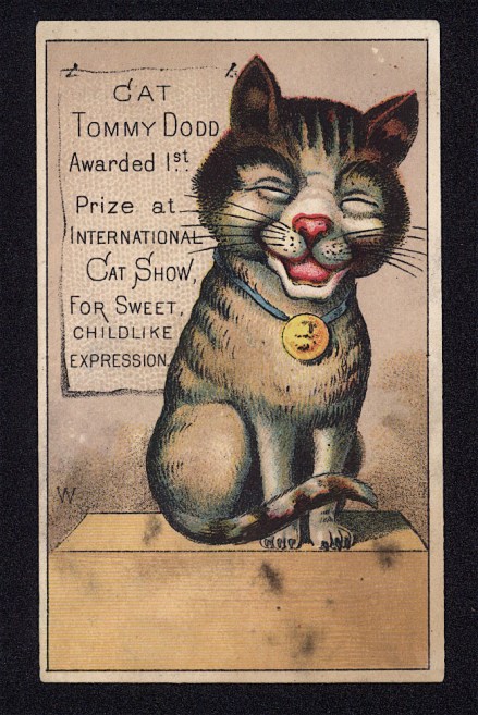 First, there is a tweet from the San Francisco public library of this card with the following post about the image on this card:  Tommy Dodd sends his #caturday greetings! This adorable cat won first prize at the International Cat Show, and then was featured on a trade card for a shoe store specializing in children’s shoes, on Stockton Street. In the San Francisco History Center’s trade card collection. Mine shows no evidence of San Francisco or children’s shoes, however these cards were clearly purchased by companies which printed their own message on the back or bottom. Still, um, somehow I doubt this was a real cat who one a prize at an international cat show – just a guess.