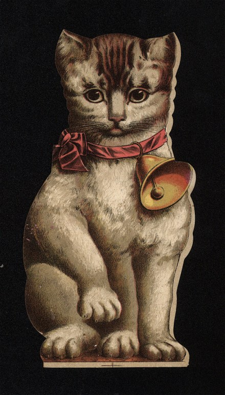Pam’s Pictorama: This kitty cut-out is about six inches high. She (pink ribbon makes me think she and there’s a certain girl cat quality) sports a rather enormous bell – gosh, birds were certainly safe around this cat unless they were stone deaf. Kim is not a fan of this particular acquisition in the cat advertising category. I admit that is later than the Victorian cards I have been purchasing and it seems to have had another purpose. As you can see below, the back of the card is both advertising for the soap and instruction for the use. Soap Kitty had a Doggie partner as well and you could obtain on of these Cats or Dog. Purchase 3 cakes of BOGUE’S SOAP for 25 cents. I have supplied the dog as a grab off of Google and he is missing his “stand-up strip” which obscures the interesting if racist diatribe on the back of the cat card, also shown at the bottom of the post.