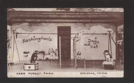 I doubt that the remaining cat and dog which needed homes were descendants of my crew here, although you never know. You will note the sign on the wall only promises Dogs and Cat. It took me a long time looking at this photo to find that single cat – up on the highest platform, white with dark cow-spots and wearing a harness. It is impossible to see for sure, but I can almost detect what I call piss-cat ears of annoyance on the fellow. The fact is, we all know cats don’t train especially well and do not appear to enjoy it. While dogs seem to like the interaction and having a job, with cats at best it seems to be a treat filled system which involves an uncomfortable level of coercion. (You may remember a post that provides an even earlier glimpse into the world of trained kitties, Mad Jenny.) Still, in my imagination somehow I persist in seeing glorious Busby Berkley type cat performances – glittering collars and dozens or more happily dancing kitties – with me as the mistress of ceremony, wearing my circus-girl costume, right in the middle of it all.