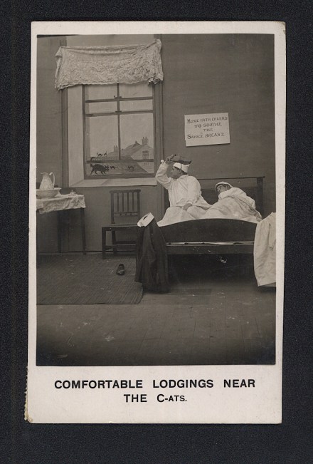 Pam’s Pictorama Photo Post: While I am a fan of cat photos, and as my readers know usually buy photos because of the presence of a cat, in some photos like this one, it has to be admitted that the cat is coincidental at best. Although I do find it truly charming that the big fellow in the upper left snatched up that puss in time for the photo, it is not what strikes us most about this glorious photo of these men and boys in the midst of some sort of a beer break among whatever work was being done among these logs. This card is unused and undated – no identification of where or when this might have been taken. A guess puts it back in the teens judging from the clothing.