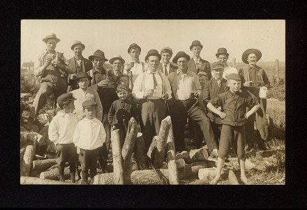 Many people have written about the demise of men’s hats and this photo tells quite a story through the hats. Every single man and boy is wearing one. The variety ranges from numerous bowlers on the suited men, a series of almost identical caps on the boys and then all sorts of well-worn broad brimmed hats on the men in work clothes. Everyone has pushed their brim back a bit for the photo. They are all photo conscious in a great way. And in some ways, this is why I collect these photos – to savor a moment of time in the past when everyone stopped for just a moment and said, “Look at us; we’re having a great time and we want to remember it.”