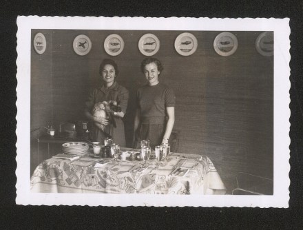 This smallish table somehow manages to have eight place settings on it which seems ambitious – although I think I have had six people eat around our flat files so I guess one can do anything if a bit creative. There is a general festive sense about the scene, and it is easy to assume that it is documenting the anticipation of a happy occasion. The Siamese cat, who seems to have a grouch on, is the only exception to an otherwise jolly scene, but we know how cats can be – you can’t judge general ambiance by them. The two women are attractive and seems to be genuinely happy, not just smiling for the camera, and who (besides kitty) can blame the one for scooping up puss for posterity in the photo? From the clothes, make up and general look I would put this photo in the late forties or early fifties. My guess is that it was indeed a lovely day.