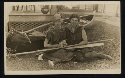 Judging from the clothes it is from the teens – those early swimsuits, stockings and shoes were what attracted me to this image to begin with. Instead of seeming onerous, as those outfits sometimes do when associated with sand and water, these togs seem sort of fitting for a day on the water canoeing. I like the bits of decoration on them – the bow on one, the white piping on the other. The dark haired girl has such a sweet face! The one who scooped up the kitten looks a bit accusatory, glaring at the camera. It is a pretty, tiny kit, just about to enter the gawky adolescent stage of cat. She or he looks all white but that might be an illusion of the sepia toned film. The state of the grass and the scattered leaves makes me wonder if it is perhaps early fall instead of summer as I originally assumed.