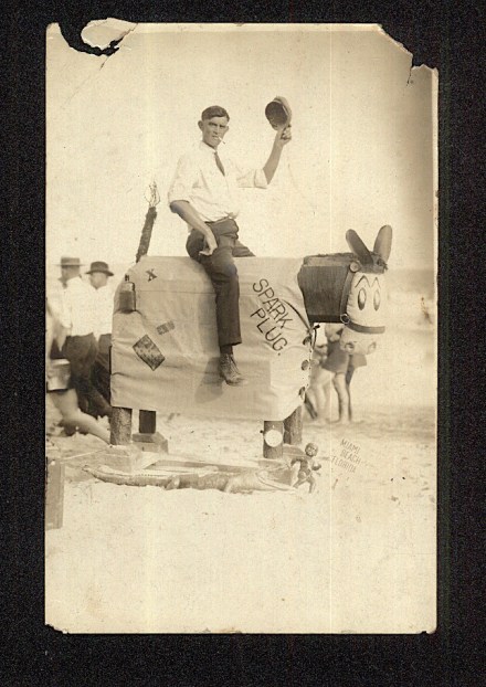 Clint Flynn did not seem to make his way into local lore so we do not know anything about him except that in roughly 1923 (according to the seller who must have calculated this from the album it came from) he perched atop of Spark Plug while at Hardie’s Casino, Miami Beach, Florida and had his photo taken by H. H. Duncker, cameraman, as per the back of this photo. I like his bravado – embracing the situation for all it is worth and creating a sense of movement on this very stationary version of Spark Plug. Go Sparky, go! Spark Plug appears to be made mostly, or entirely, of wood, tail standing straight up in back like a frowsy flag. I also draw your attention to the strange little figure, chased by an alligator in the bottom right which I did not see until purchasing the photo and studied it, next to him a tiny and almost unreadable sign, Miami Beach, Florida. (This photo has also been enhanced by the Photoshop magic of Mr. Kim Deitch.)