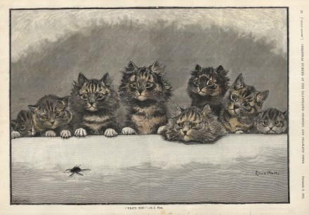 With the title, What’s This? and identified as L. Wain he perfectly captures the curiosity of these kitties eyeing this insect. He has signed the image itself and there is another mark I cannot make out which I assume is the engraver’s. I like the limited use of color which gives this a bit of warm and brings out the image. However, most of all, I like the little claws emerging on each of the kits! Cats #3 and #4 (in line, left to right) are emerging toward full blown Louis Wain style. All eyes are on that bug which is slated to be a snack for one of these fellers if he doesn’t skitter fast! For comparison, below is a later painting of a similar theme I snatched off the internet. Cats and bugs have legs as a subject.