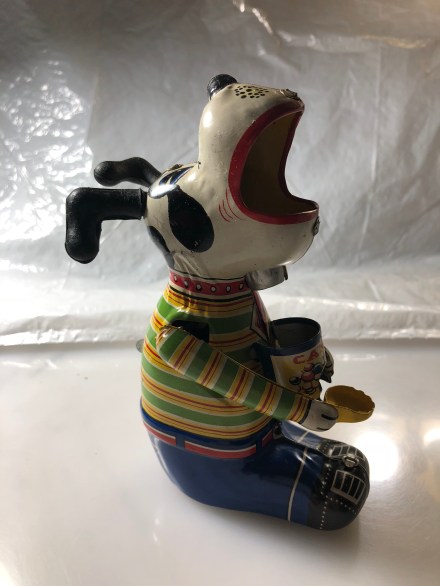 As always, the box offers additional charm, the text on the front Mechanical Candy Loving Canine, ALWAYS HUNGRY NEVER SATISFIED, with a fair cartoon rendering of the dog toy with a cat and dog looking on with amazement – Gosh how much can he eat? When will he stop? And then what appears to be for all the world, a mole popping up out of the ground in the bottom right corner. The mole shown on two sides with the dog too, the other sides are instructional about the use of the toy – in case you couldn’t figure it out. This little fellow was made in Japan, as is probably to be expected of a tin toy of this era. If you believe as I do, that toys bring joy, then hopefully this little fellow brightens up your day today.