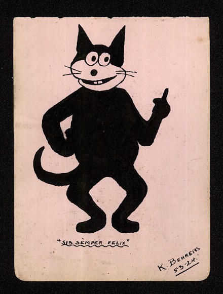 Pam’s Pictorama Post: Translated from the Latin, roughly, Always Felix. You may remember that aways back I purchased some hand colored images of Felix, shown below, which are similar in that they seem to have both a pre-printed yet hand-painted and drawn quality, leaving me wondering if the outline was somehow printed and then then black of Felix and the colors hand executed later. Both those cards and this one are on a lightweight paper – so although postcard size questionable that they were meant to stand up in the mail to begin with, this one has a torn top edge like it came from a book of some kind. I have seen additional versions of the cards below since I purchased my lot, although I have not acquired more. (Have to leave something out there for the other Felix collectors, right?) Today’s feature, and those below are all, not surprisingly, products of Great Britain and were purchased from sellers there.