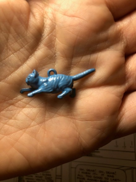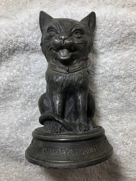 Pam’s Pictorama Post: I consider today’s item a real treasure. I found it while trolling idly on the internet and snatched it up. As objects go, it is splendid, a cast metal with some heft to it, about eight inches high. The cat’s expression is great, with an almost but not quite winking eye – a wicked look. His lashing tail, curled precisely around his feet. There is a tiny ring at the base of his collar and I wonder if a small ribbon or something was originally adorning him. There are traces of red on his face and the base and there is something inscribed on the back of his neck I cannot make out. (See below.) The seams on his casting are evident – he was after all inexpensively made. Kitty is perched on a pedestal which is inscribed, Charley’s Aunt 100th Performance Chicago Hooley’s Theater Wednesday July 25th 1894. I do wonder what sort of jolly world Chicago 1894 must have been if you were lucky enough to go to the 100th performance of this play and receive this great cat statuette? My mind boggles at such riches.