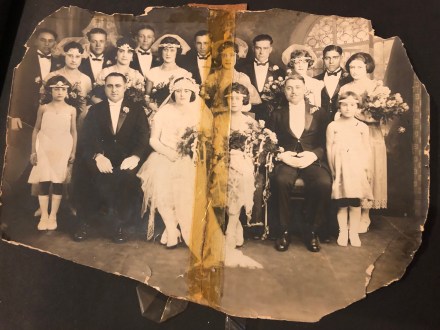 This fragment is the wedding photo of my great aunt Rose (née Cittadino) to a man named Al Mazza, whose wedding feast held in the backyard I decades later knew as my grandmother’s, which was shown yesterday. (I am a bit stunned by the poor condition of both of these photos, but this is clearly a case of taking what you can get. Like yesterday, this is a photograph of the photo I took with my phone.)