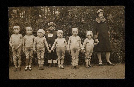 Pam’s Pictorama Photo Post: I resisted this photo as long as I could because it was expensive, but had to purchase it. (Full disclosure: Kim has tweaked the contrast on this in Photoshop which improves it considerably.) There’s no explanation on the back of this card and it was never sent, but it does speak for itself. I must say, with perhaps one exception (second girl from the left end), as a group they don’t appear happy about what I consider to be their jolly cat costumes. And my goodness, poor #6, in his enhanced, darker costume doesn’t look happy at all. Even mom doesn’t look thrilled. It’s a glum group of kitties. (A careful look leads me to believe the adult is at a minimum related to the child whose hand she holds and #6.)