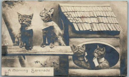 Pam’s Pictorama Photo Post: This entertained me with its little bit of photo collage that makes it possible. The noisy boy kittens (I think they are wearing shirt collars like they just came from a late night party) are “singing” to these proper girl cats, who sport enormous bows, presumably it is their human neighbors who are also being serenaded, much to their chagrin. I am especially enamored of the little house the girl cats are in. This card was mailed on October 22, 1907 at 5:30 PM from Lyons, Kansas to Miss Dorothy Curtis, Villisca, Iowa. (Villisca remains a very small town, only 1200 people as of the 2010 census so even today maybe a street address isn’t needed. The town is evidently best known for an unsolved axe murder in the summer of 1912.)