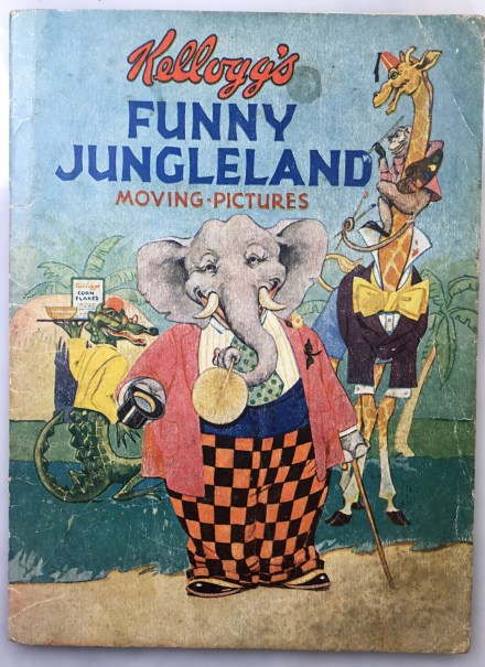 Pam’s Pictorama Post: When researching my Kellogg’s Crinkle Cat (immortalized a few weeks back in my post Crinkle Cat – For Kiddies, not Kitties! which can be read here) I discovered this earlier premium and set out immediately to purchase one. I read online that this Funny Jungleland Moving Pictures book was the first cereal premium – originally given away in stores, it dates back in its earliest form to 1909. It quickly became something you mailed away for instead and it cost you ten cents. Quite a switch as ten cents was a bit of an investment at the dawn of the 20th century and perhaps that explains why so many were kept and exist today.