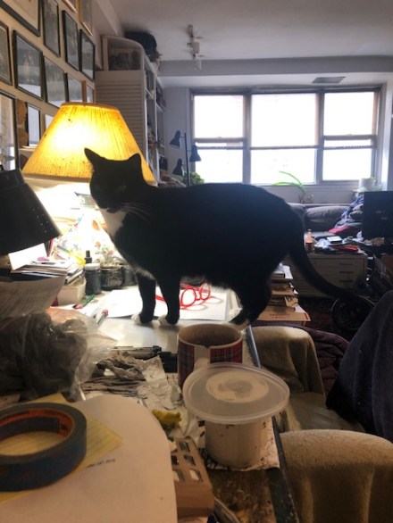 I guess I figure come what may, somehow furniture will find a temporary perch, room will be made and windows replaced. Hopefully no furniture, toys, cats or people will be injured in the process. I will then find the stamina to empty our tiny but packed kitchen for phase two. (I’m sure you will hear more from three weeks of kitchen work and at least a week of take-out eating as a result.) As you see above, Cookie is at the ready to help. As I write she is supervising Kim packing Frank Merriwell paperbacks. (Blackie is snoring on the bed having assumed the warm spot I left upon rising earlier, as is his habit. For now he is unconcerned with this adventure. I am cat-like in my own craving for home quiet and routine. My own fur is therefore ruffled greatly.)