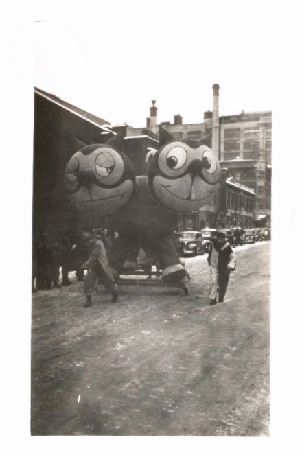 Like the Felix balloon in my earlier post, Felix Floats (which can be found here, photo above) this two-headed cat balloon might have been made by Tony Sarg, famed early balloon maestro of the Thanksgiving Day parade. The balloon in today’s photo appears to be on a dolly of sorts to be moved into place. Sarg was a German American puppeteer by training but is best known for birthing his Seussian-like balloon creations for the early Macy’s Thanksgiving Day parade. Since his assistants ultimately opened their own studios and other competing studios appeared (this eventually forced him into bankruptcy in 1939), and without a date, it is hard to say if this was a Sarg balloon or not. Nor can I say for sure that this was for the Macy’s parade as the photo seems to be taken in a staging location. I have never seen this particular balloon in other photos before. It is certainly in keeping with his style though, and if I was a betting woman (alas, I am not) I would say it is by him.
