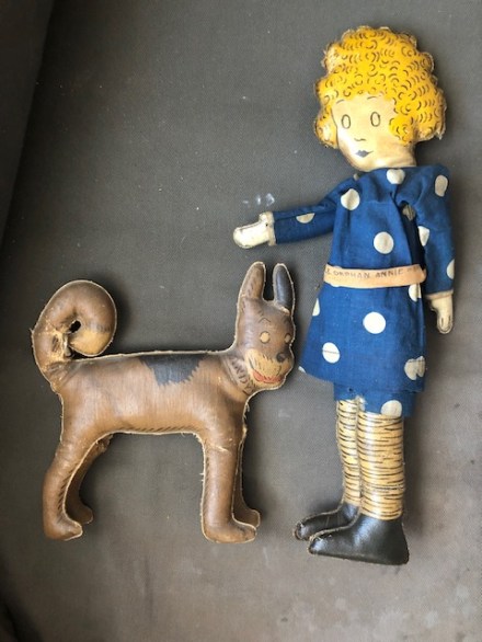I assume that these oilcloth toys came out of earlier, more homely, variations and that from them eventually come the premiums that you were required to sew yourself. I recently examined those via an acquisition of a Kellogg’s Crinkle Cat. (You can read that post here.) Oilcloth is sturdy and Annie is solidly made. There is evidence that she was much played with and beloved. As much as I like my toys in good condition, it is good to know they have been well used and loved too.