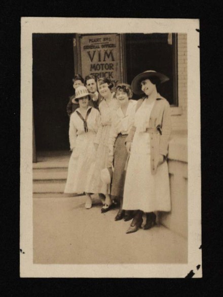 I wonder if these could have been employees of VIM Motor Trucks. (If you look carefully, there’s a man and a boy to the back of the group.) VIM Motor Trucks, under that name, was only in business between 1915 and 1921. Based on the women’s clothing I would lean toward the earlier part of the run. Women were entering the realm of office work at about that time – it is pure speculation but possible.