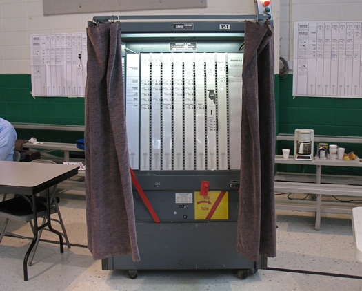 However, I also actually like the very act of voting. I deeply miss the voting machines New York clung to for a very long time. These antique metal boxes, with their pull-string privacy curtains, had lovely little colored levers you would push, ticka-ticka-ticka, you would pull the big metal handle into place your vote was counted. It was somehow very tactile and satisfying – you really knew you had done something when you pulled that lever.