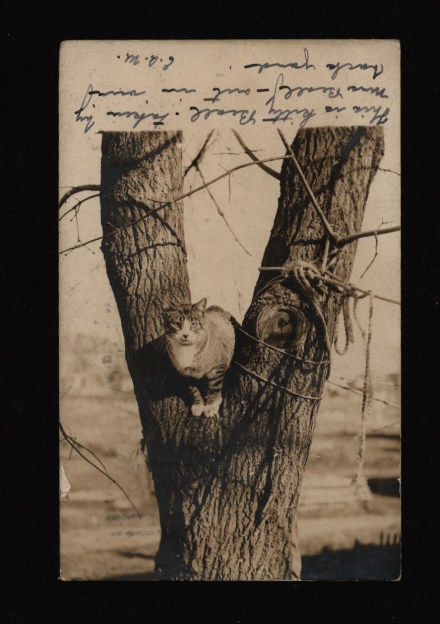 Kitty is a nice tabby and I wish E.A.M. had shared his or her name. Puss is looking right at the camera and it is a good shot. There seems to be a bit of rope tied to the tree and I would hazard a guess that it is a clothesline. If you look carefully there are some blurry house at some distance behind this yard. For July the yard and tree are looking none too lush so perhaps the photo was snapped at another time and the postcard only used in the summer. It looks more like the sort of November day I see outside my window right now.