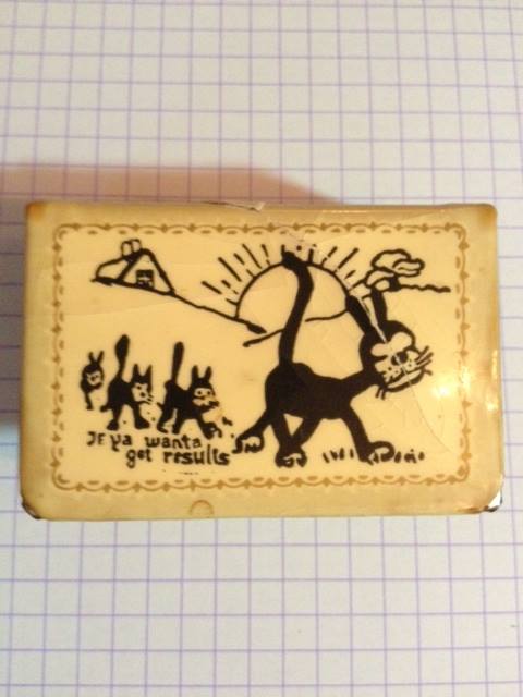 This Felix match holder feels like it was made commercially, if perhaps by a small enterprise. The wood is very light. I like the addition of this fang-y sort of gap tooth grin and the four decorative whiskers. The face looks as though it was sprayed on through a stencil of sorts. He has some wear on him and it would appear someone reached in for many matches over time, wearing the white paint of the cup away almost entirely. The place where he hung from a nail on top, is almost worn through – probably pulled a bit on the nail when matches were taken each time. It is my only hesitation about whether he hangs in the kitchen or remains with the toys in the other room.