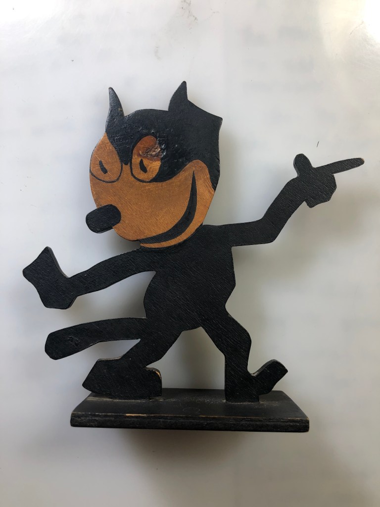 These off-model Felix pieces are like primitive art and it is hard to say if they were made from designs, maybe in magazines, or were just simply made items pounded out and sold, capitalizing on Felix’s appeal and flying under the radar of the copyright cops. Years ago I wrote about the East End of London shops which turned out some of my favorite gleefully free-form mohair Felix toys (almost assuredly not licensed) as a way of employing indigent women in the East End of London. (That post can be found here and is a favorite. I wrote about another such homemade piece, shown below, which can be found here.)